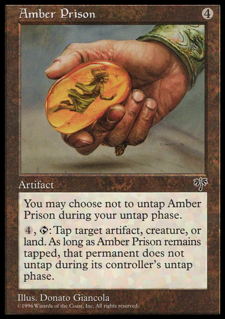 | Oracle Text | You may choose not to untap Amber Prison during your untap step. {{4}}, {{t}}: Tap target artifact, creature, or land. That permanent doesn't untap during its controller's untap step for as long as Amber Prison remains tapped. | ||