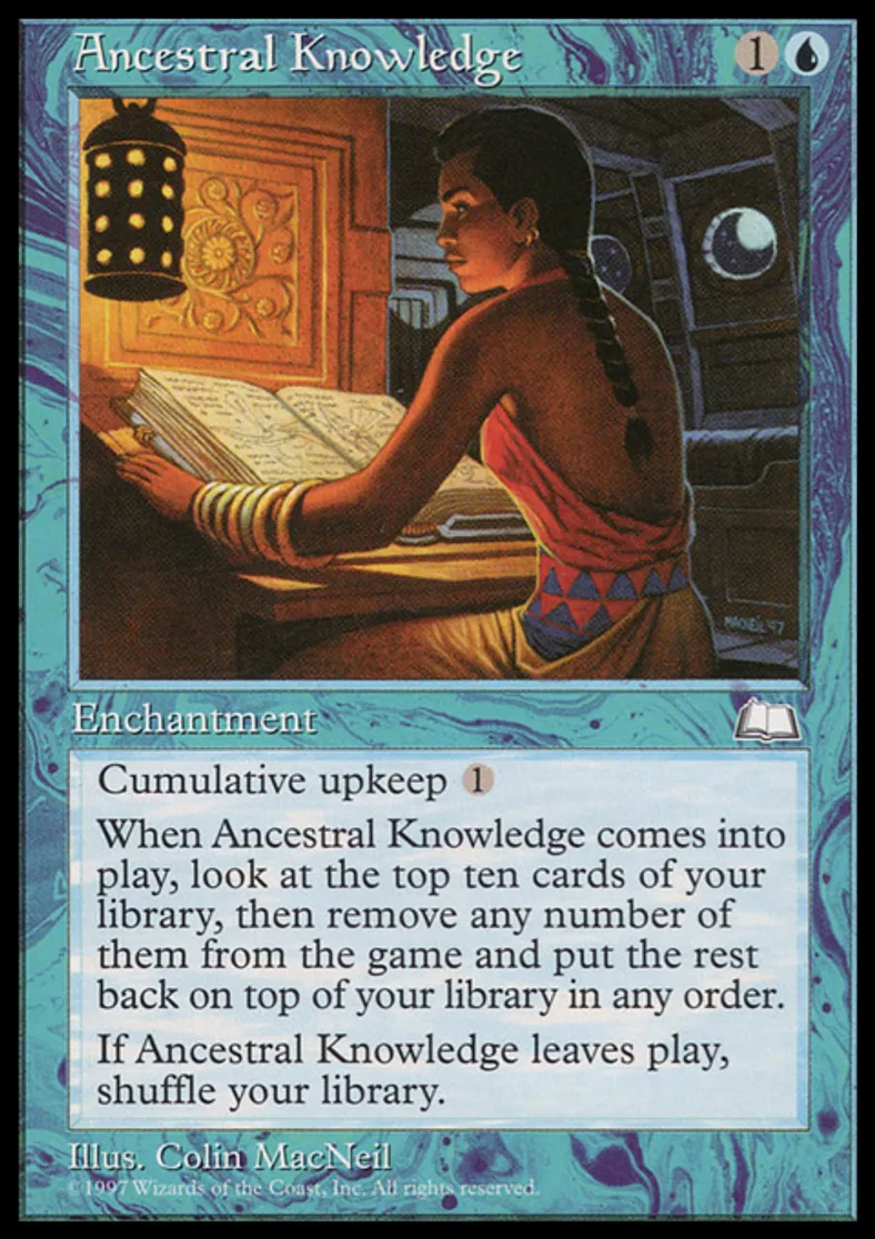 | Oracle Text | Cumulative upkeep {{1}} (At the beginning of your upkeep, put an age counter on this permanent, then sacrifice it unless you pay its upkeep cost for each age counter on it.) When Ancestral Knowledge enters the battlefield, look at the top ten cards of your library, then exile any number of them and put the rest back on top of your library in any order. When Ancestral Knowledge leaves the battlefield, shuffle your library. | ||