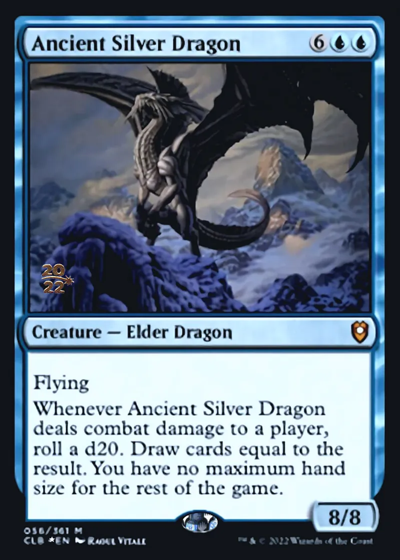 Whenever Ancient Silver Dragon deals combat damage to a player, roll a d20. Draw cards equal to the result. You have no maximum hand size for the rest of the game. | ||