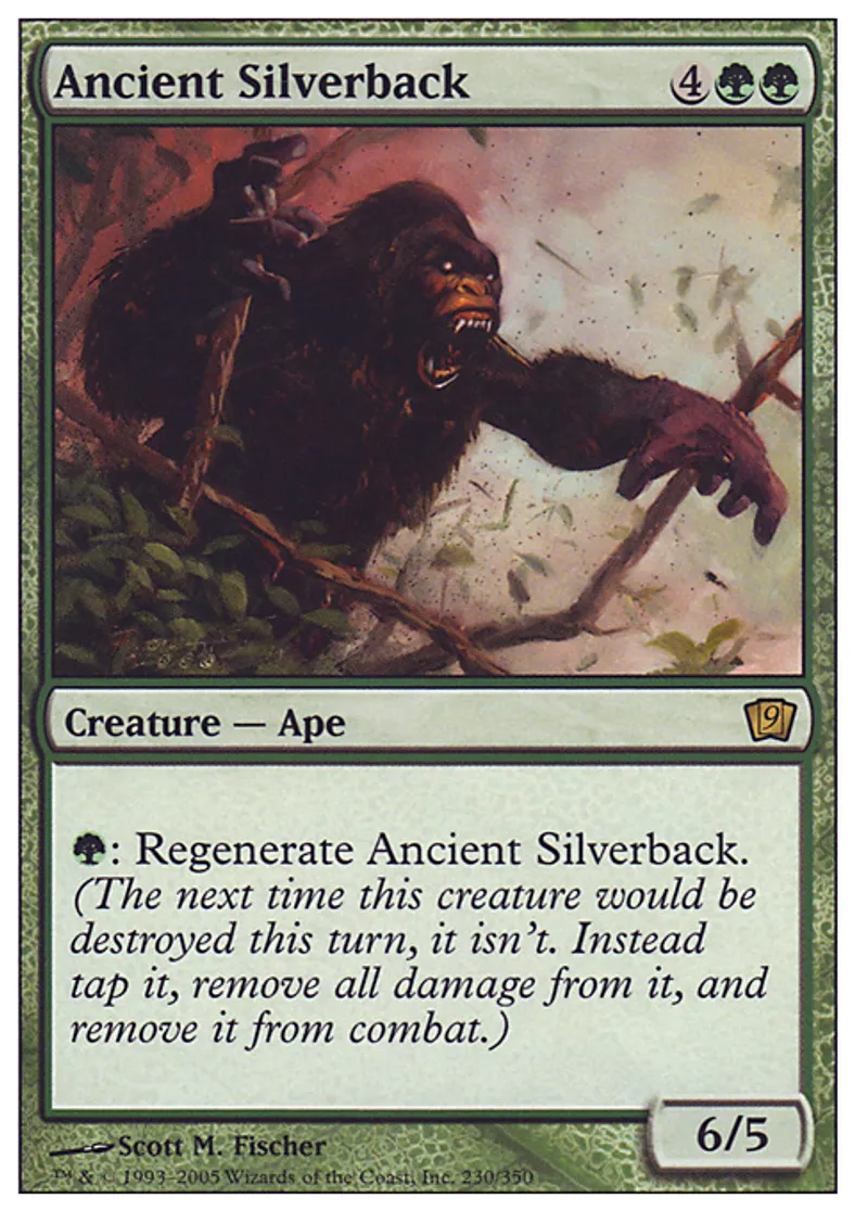 | Oracle Text | {{g}}: Regenerate Ancient Silverback. (The next time this creature would be destroyed this turn, it isn't. Instead tap it, remove all damage from it, and remove it from combat.) | ||