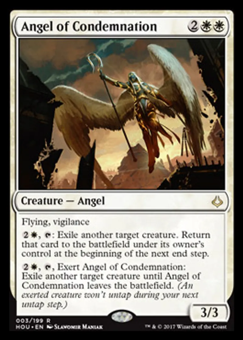| Oracle Text | Flying, vigilance {{2}}{{w}}, {{t}}: Exile another target creature. Return that card to the battlefield under its owner's control at the beginning of the next end step. {{2}}{{w}}, {{t}}, Exert Angel of Condemnation: Exile another target creature until Angel of Condemnation leaves the battlefield. (An exerted creature won't untap during your next untap step.) | ||