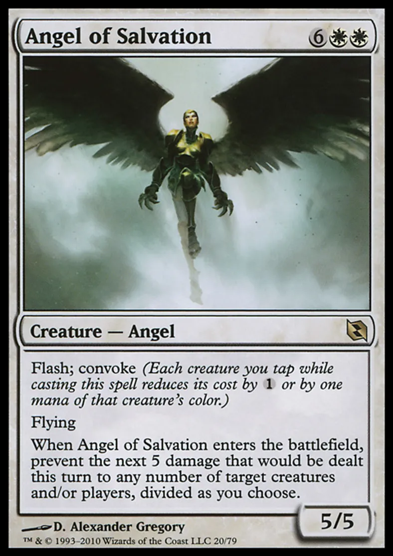 | Oracle Text | Flash; convoke (Each creature you tap while casting this spell reduces its cost by {{1}} or by one mana of that creature's color.) Flying When Angel of Salvation enters the battlefield, prevent the next 5 damage that would be dealt this turn to any number of target creatures and/or players, divided as you choose. | ||