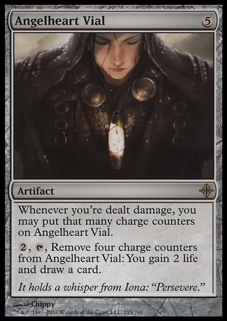 | Oracle Text | Whenever you're dealt damage, you may put that many charge counters on Angelheart Vial. {{2}}, {{t}}, Remove four charge counters from Angelheart Vial: You gain 2 life and draw a card. | ||