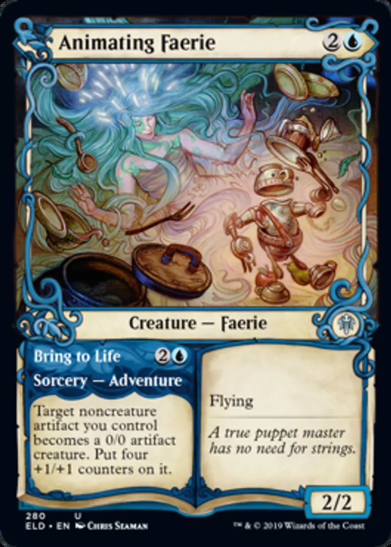 Magic: the Gathering (mtg) Uncommon Creature — Faerie // Sorcery — Adventure Animating Faerie from Throne of Eldraine (ELD) last updated 2026-02-21 17:01:02