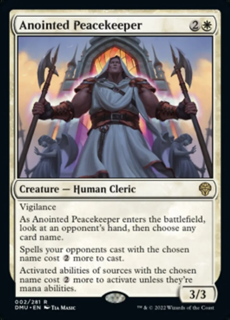 As Anointed Peacekeeper enters the battlefield, look at an opponent's hand, then choose any card name.