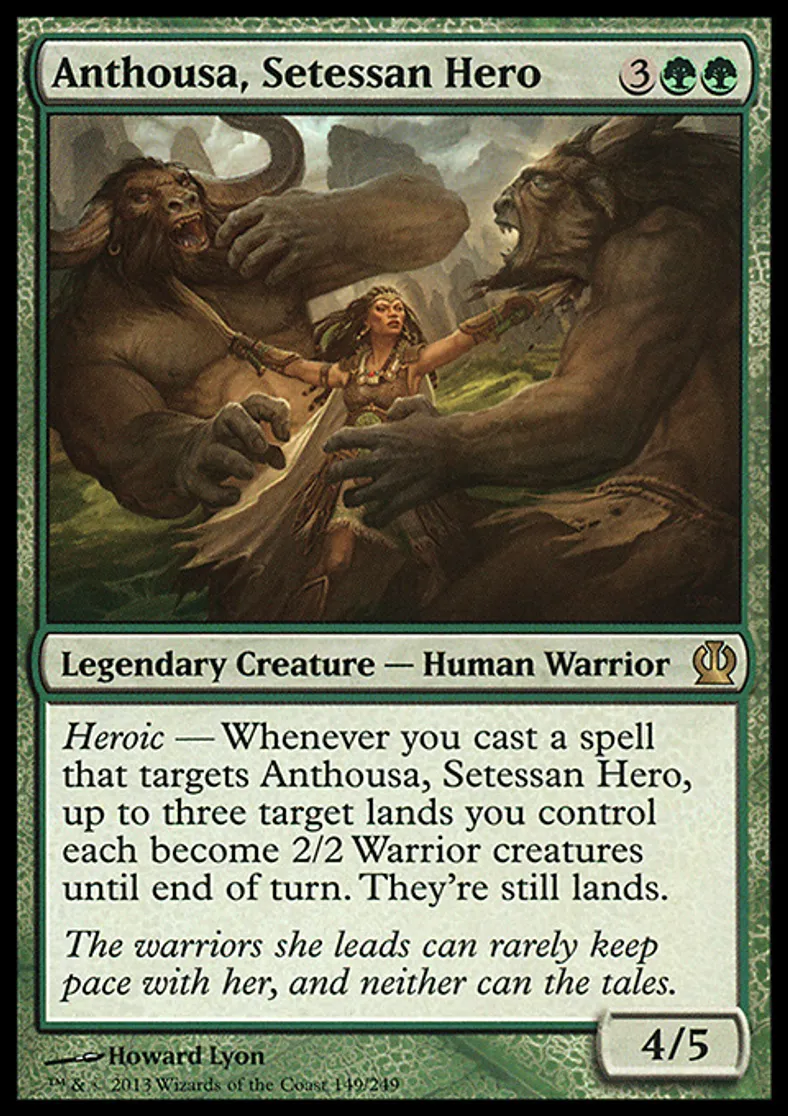 | Oracle Text | Heroic — Whenever you cast a spell that targets Anthousa, Setessan Hero, up to three target lands you control each become 2/2 Warrior creatures until end of turn. They're still lands. | ||
