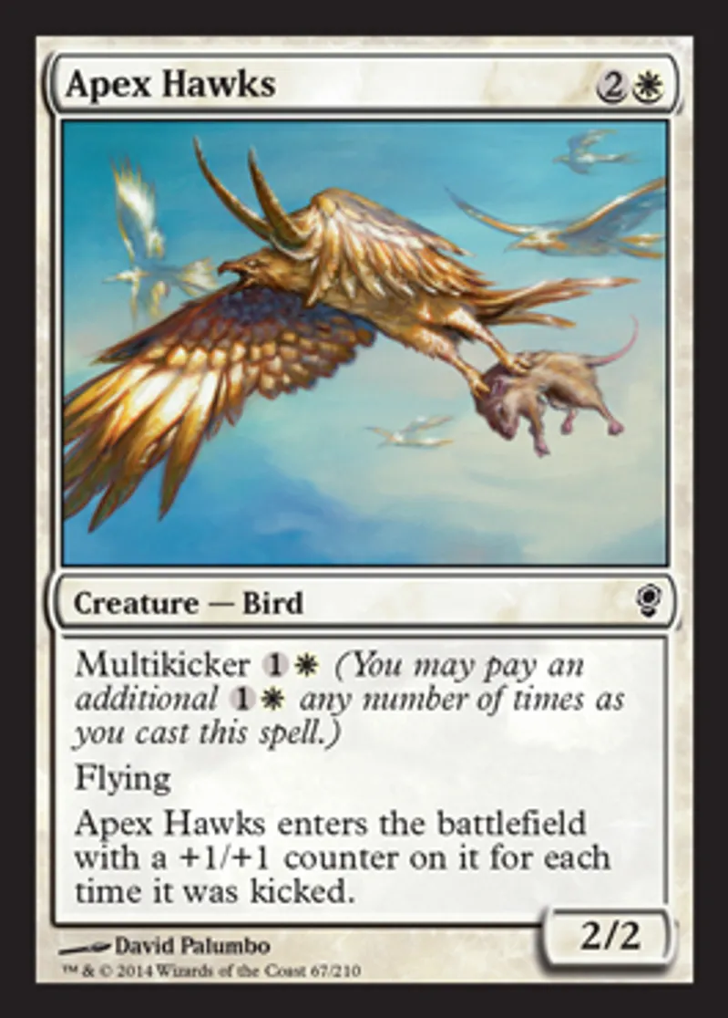 | Oracle Text | Multikicker {{1}}{{w}} (You may pay an additional {{1}}{{w}} any number of times as you cast this spell.) Flying Apex Hawks enters the battlefield with a +1/+1 counter on it for each time it was kicked. | ||
