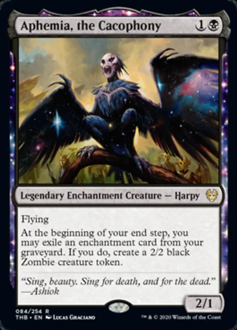 Magic: the Gathering (mtg) rare Legendary Enchantment Creature — Harpy Aphemia, the Cacophony from Theros Beyond Death (thb) last updated 2026-02-21 17:01:36