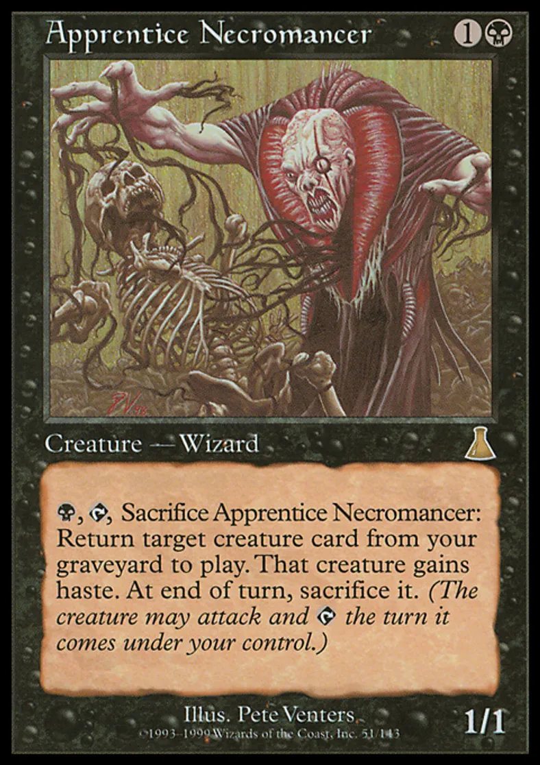 | Oracle Text | {{b}}, {{t}}, Sacrifice Apprentice Necromancer: Return target creature card from your graveyard to the battlefield. That creature gains haste. At the beginning of the next end step, sacrifice it. | ||
