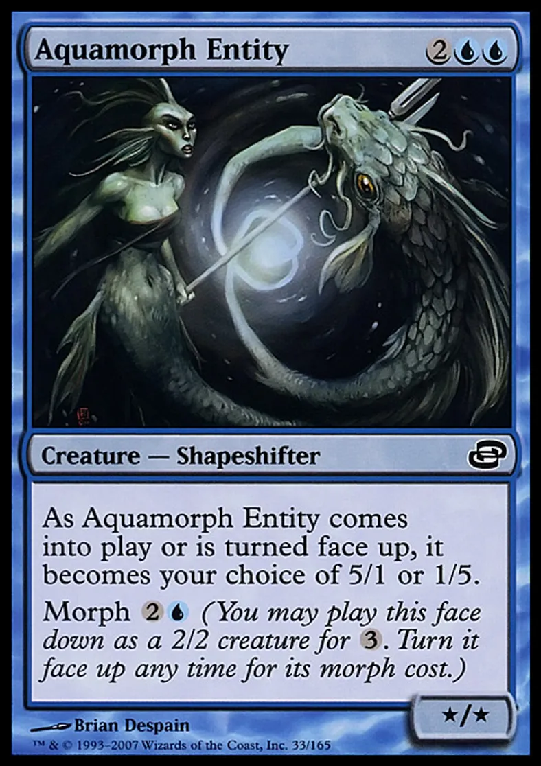 | Oracle Text | As Aquamorph Entity enters the battlefield or is turned face up, it becomes your choice of 5/1 or 1/5. Morph {{2}}{{u}} (You may cast this face down as a 2/2 creature for {{3}}. Turn it face up any time for its morph cost.) | ||