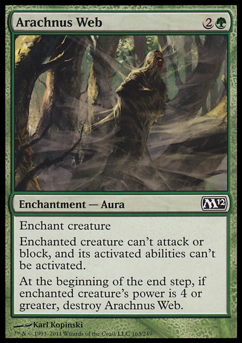| Oracle Text | Enchant creature Enchanted creature can't attack or block, and its activated abilities can't be activated. At the beginning of the end step, if enchanted creature's power is 4 or greater, destroy Arachnus Web. | ||