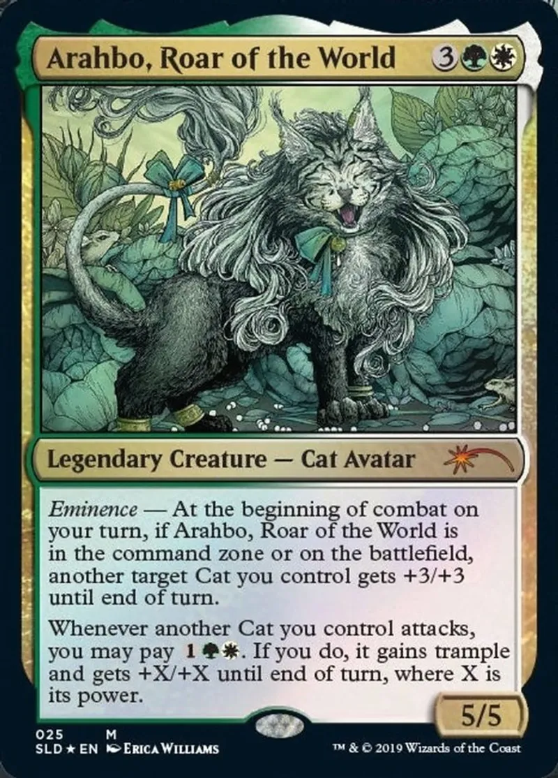 | Oracle Text | Eminence — At the beginning of combat on your turn, if Arahbo, Roar of the World is in the command zone or on the battlefield, another target Cat you control gets +3/+3 until end of turn.