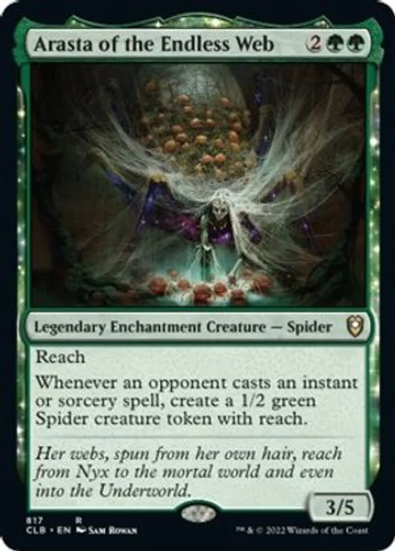 Magic: the Gathering (mtg) Rare Legendary Enchantment Creature — Spider Arasta of the Endless Web from Commander Legends: Battle for Baldur's Gate (CLB) last updated 2026-02-21 16:08:35