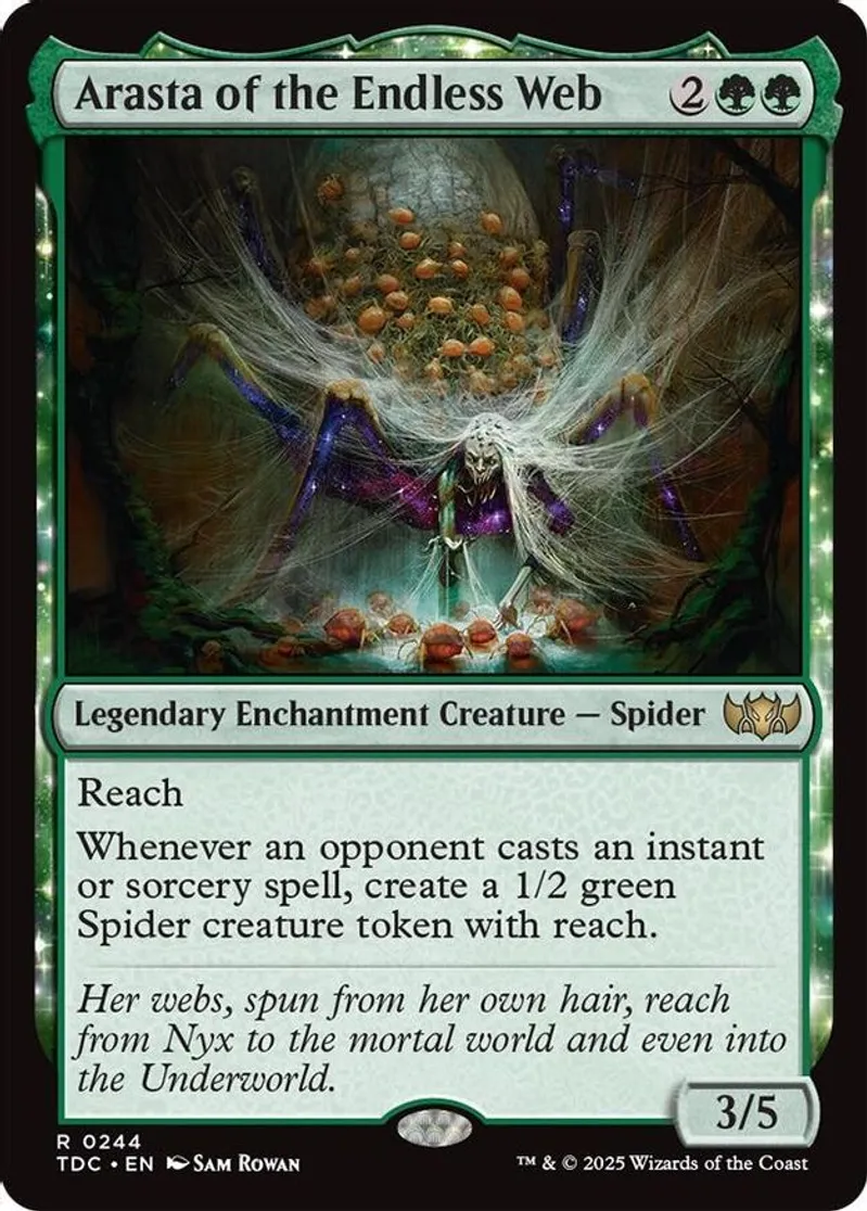 Magic: the Gathering (mtg) Rare legendary enchantment creature — spider Arasta of the Endless Web from Commander: Tarkir: Dragonstorm (TDC) last updated 2026-02-21 15:07:32
