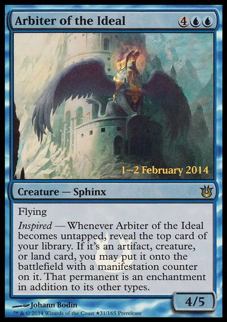 Inspired — Whenever Arbiter of the Ideal becomes untapped, reveal the top card of your library. If it's an artifact, creature, or land card, you may put it onto the battlefield with a manifestation counter on it. That permanent is an enchantment in addition to its other types. | ||