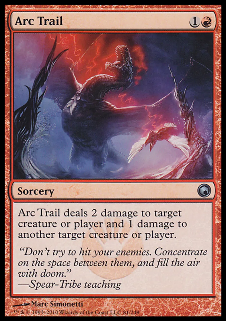 | Oracle Text | Arc Trail deals 2 damage to target creature or player and 1 damage to another target creature or player. | ||