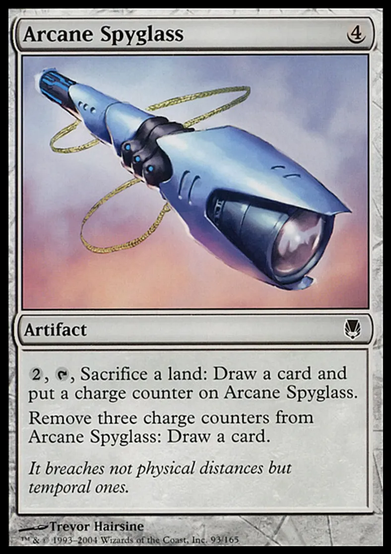 | Oracle Text | {{2}}, {{t}}, Sacrifice a land: Draw a card and put a charge counter on Arcane Spyglass. Remove three charge counters from Arcane Spyglass: Draw a card. | ||