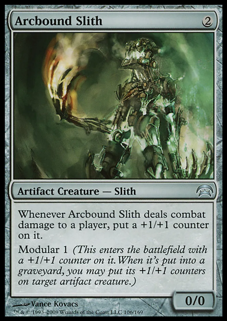 | Oracle Text | Whenever Arcbound Slith deals combat damage to a player, put a +1/+1 counter on it. Modular 1 (This enters the battlefield with a +1/+1 counter on it. When it dies, you may put its +1/+1 counters on target artifact creature.) | ||