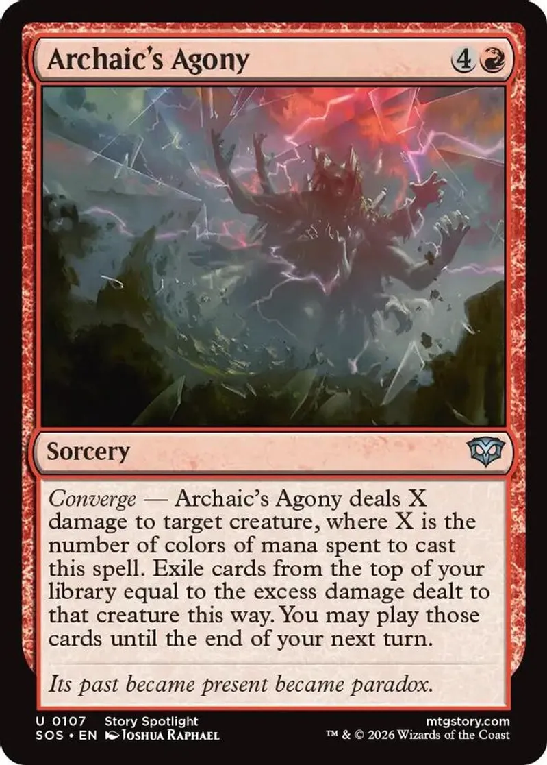 | Oracle Text | converge — archaic's agony deals x damage to target creature, where x is the number of colors of mana spent to cast this spell. exile cards from the top of your library equal to the excess damage dealt to that creature this way. you may play those cards until the end of your next turn. | ||