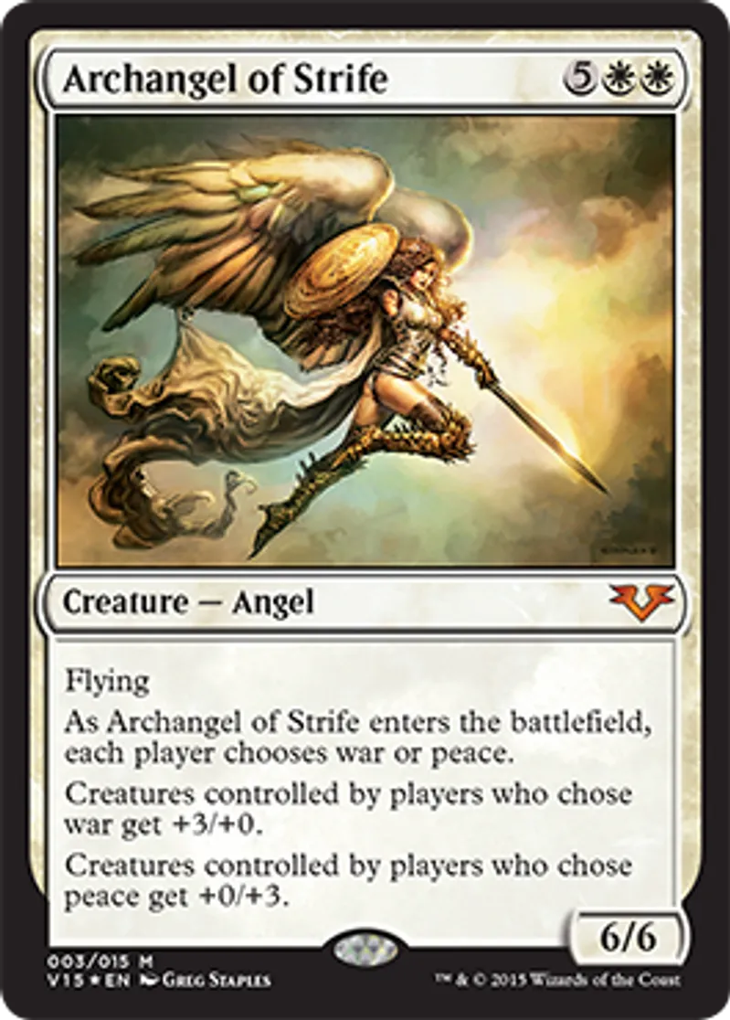 As Archangel of Strife enters the battlefield, each player chooses war or peace.