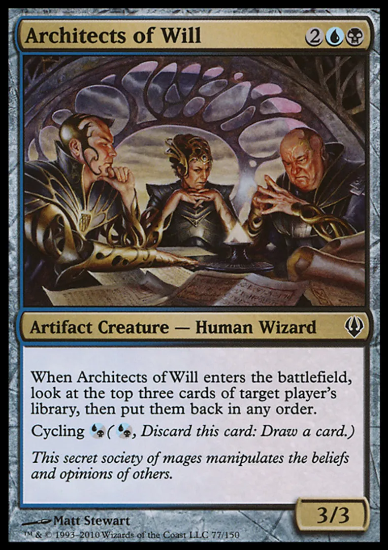 | Oracle Text | When Architects of Will enters the battlefield, look at the top three cards of target player's library, then put them back in any order. Cycling {{Blue or Black}} ({{Blue or Black}}, Discard this card: Draw a card.) | ||