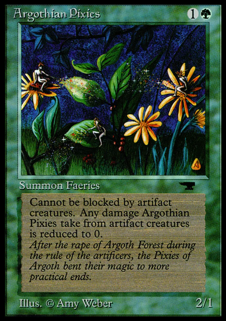 | Oracle Text | Argothian Pixies can't be blocked by artifact creatures. Prevent all damage that would be dealt to Argothian Pixies by artifact creatures. | ||