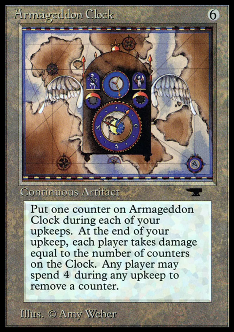 | Oracle Text | At the beginning of your upkeep, put a doom counter on Armageddon Clock. At the beginning of your draw step, Armageddon Clock deals damage equal to the number of doom counters on it to each player. {{4}}: Remove a doom counter from Armageddon Clock. Any player may activate this ability but only during any upkeep step. | ||
