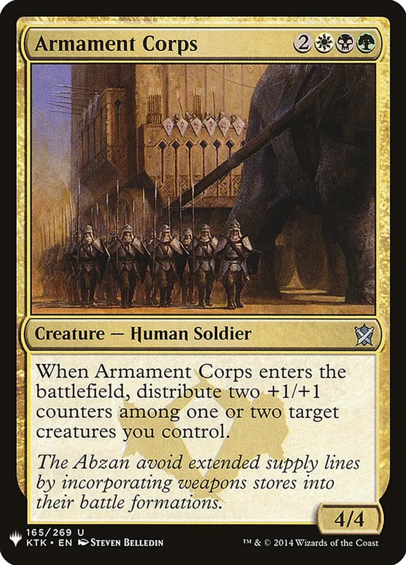| Oracle Text | When Armament Corps enters the battlefield, distribute two +1/+1 counters among one or two target creatures you control. | ||