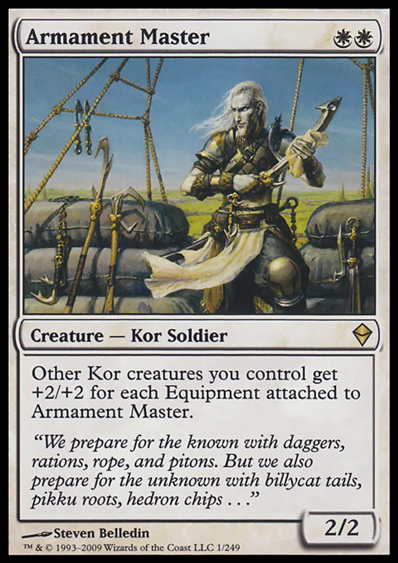 | Oracle Text | Other Kor creatures you control get +2/+2 for each Equipment attached to Armament Master. | ||