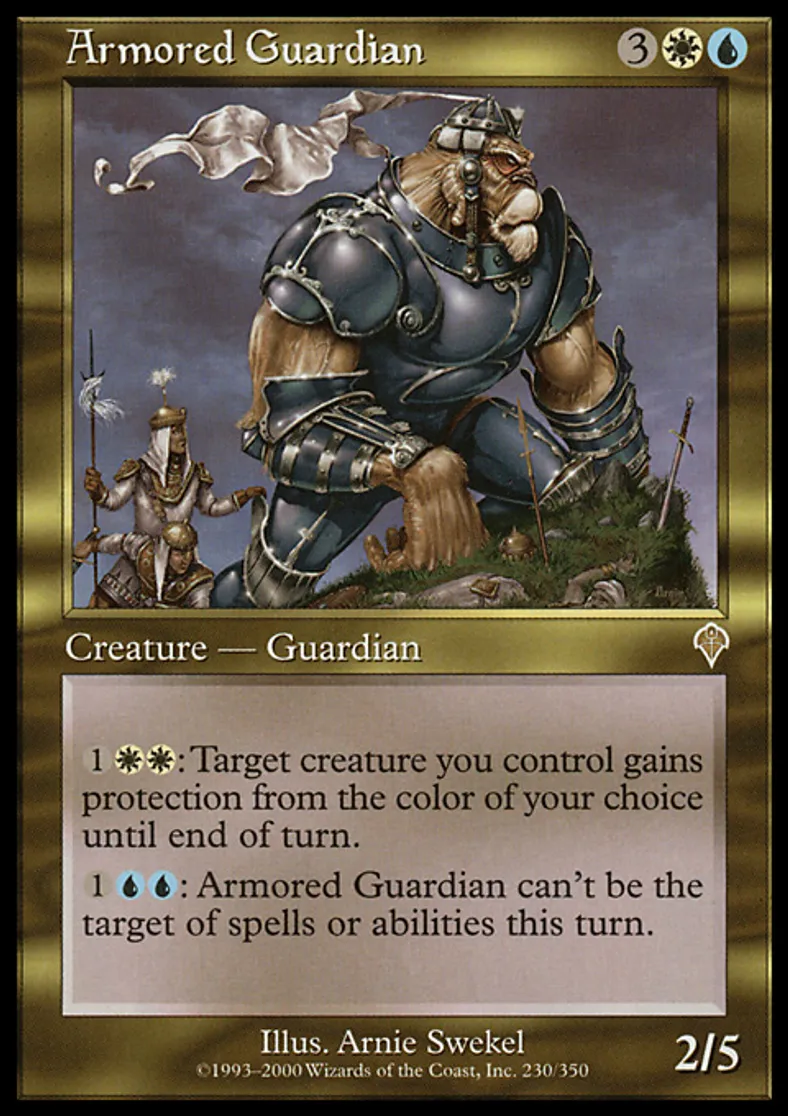 | Oracle Text | {{1}}{{w}}{{w}}: Target creature you control gains protection from the color of your choice until end of turn. {{1}}{{u}}{{u}}: Armored Guardian gains shroud until end of turn. (It can't be the target of spells or abilities.) | ||