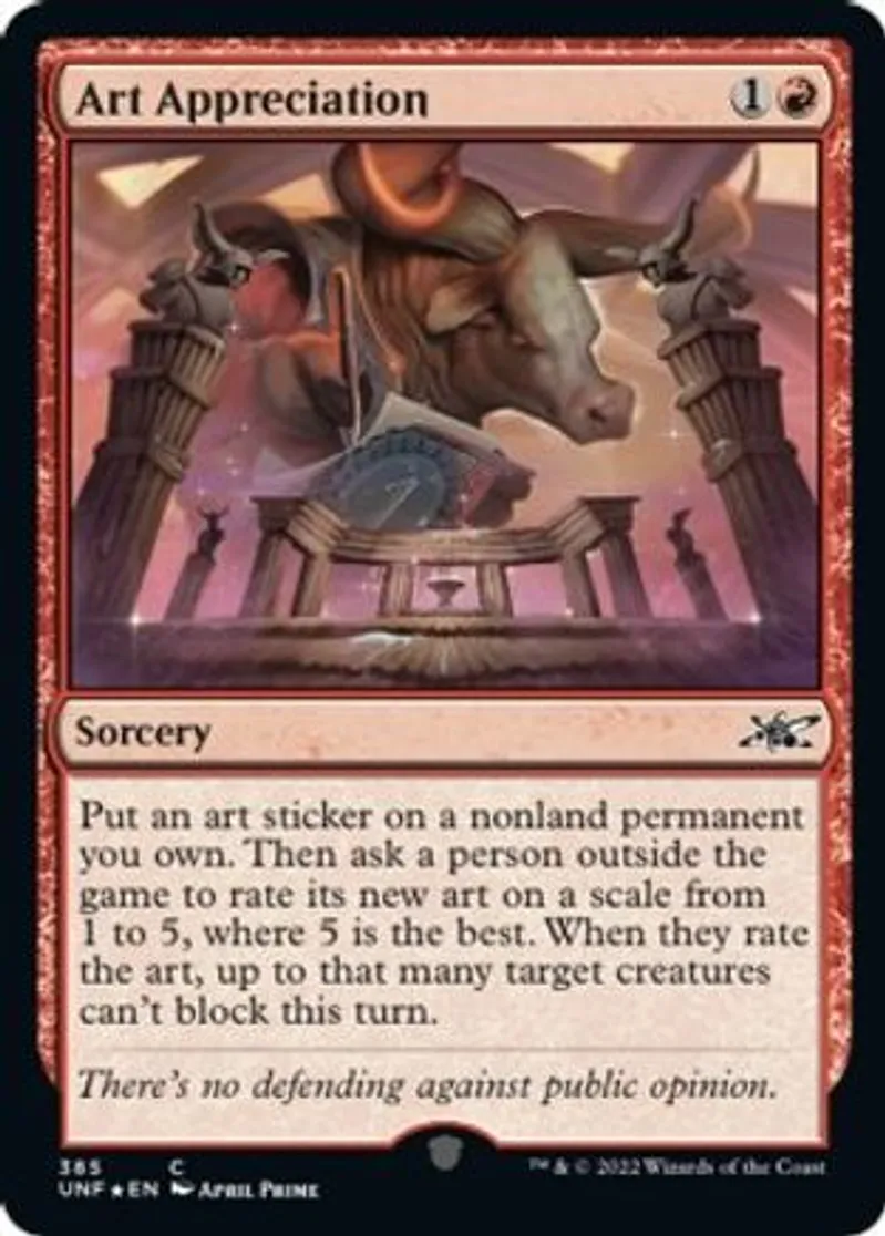 | Oracle Text | Put an art sticker on a nonland permanent you own. Then ask a person outside the game to rate its new art on a scale from 1 to 5, where 5 is the best. When they rate the art, up to that many target creatures can't block this turn. | ||