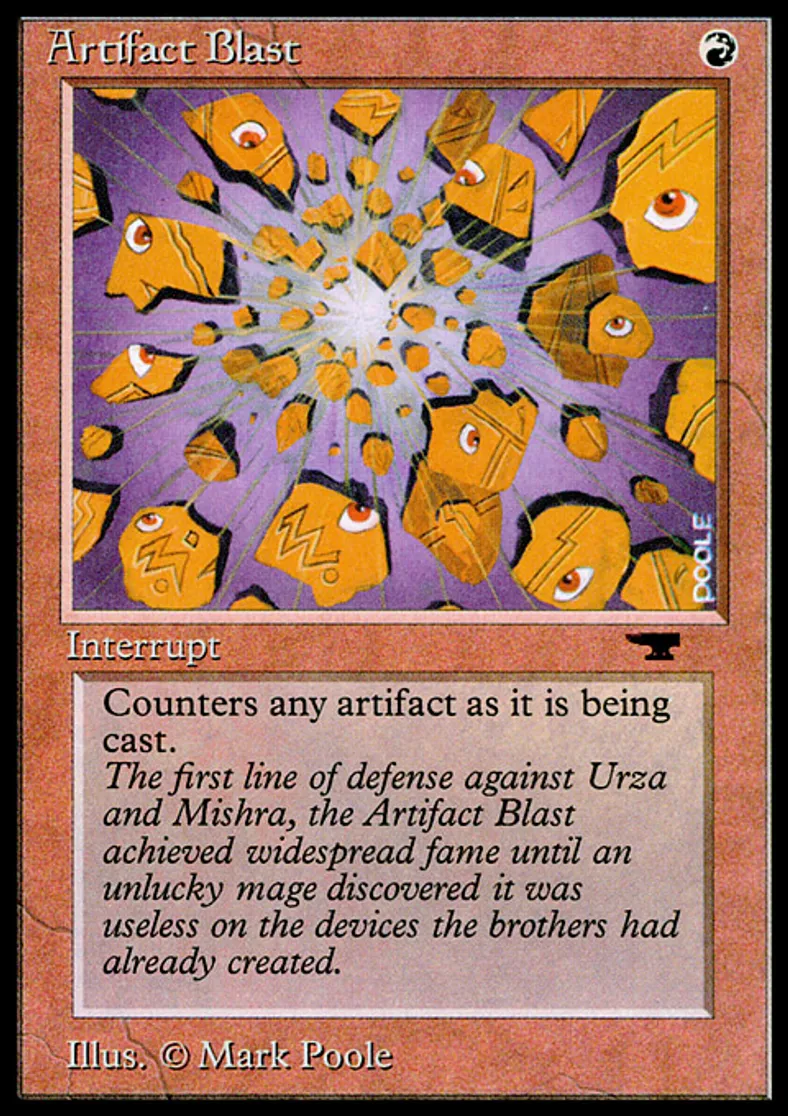 | Flavor Text | The first line of defense against Urza and Mishra, the Artifact Blast achieved widespread fame until an unlucky mage discovered it was useless on the devices the brothers had already created. | ||