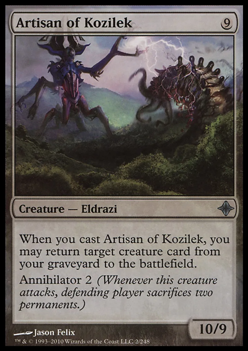 | Oracle Text | When you cast Artisan of Kozilek, you may return target creature card from your graveyard to the battlefield. Annihilator 2 (Whenever this creature attacks, defending player sacrifices two permanents.) | ||
