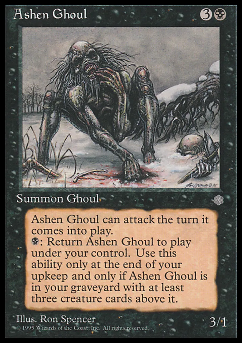 | Oracle Text | Haste {{b}}: Return Ashen Ghoul from your graveyard to the battlefield. Activate this ability only during your upkeep and only if three or more creature cards are above Ashen Ghoul. | ||