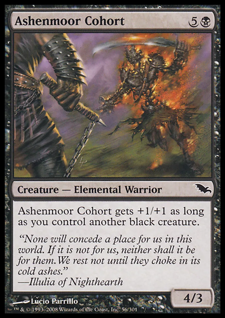 | Oracle Text | Ashenmoor Cohort gets +1/+1 as long as you control another black creature. | ||