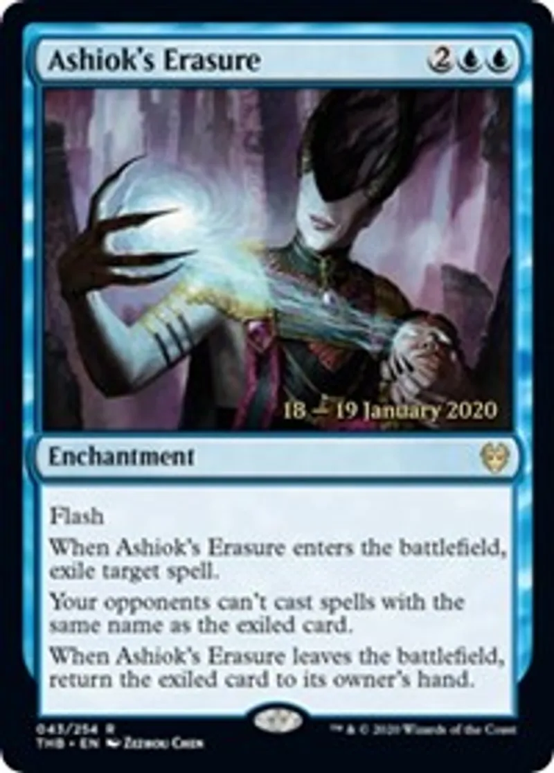 | Oracle Text | Flash\r\nWhen Ashiok\'s Erasure enters the battlefield, exile target spell.\r\nYour opponents can\'t cast spells with the same name as the exiled card.\r\nWhen Ashiok\'s Erasure leaves the battlefield, return the exiled card to its owner\'s hand. | ||