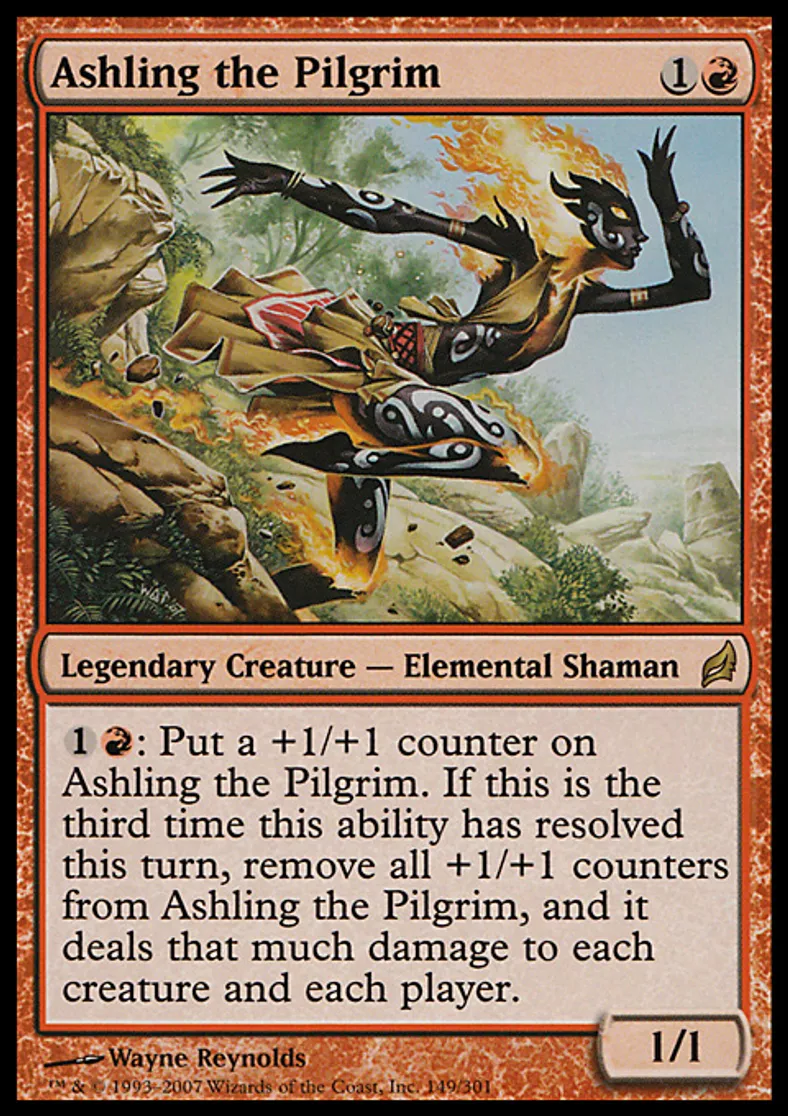 | Oracle Text | {{1}}{{r}}: Put a +1/+1 counter on Ashling the Pilgrim. If this is the third time this ability has resolved this turn, remove all +1/+1 counters from Ashling the Pilgrim, and it deals that much damage to each creature and each player. | ||