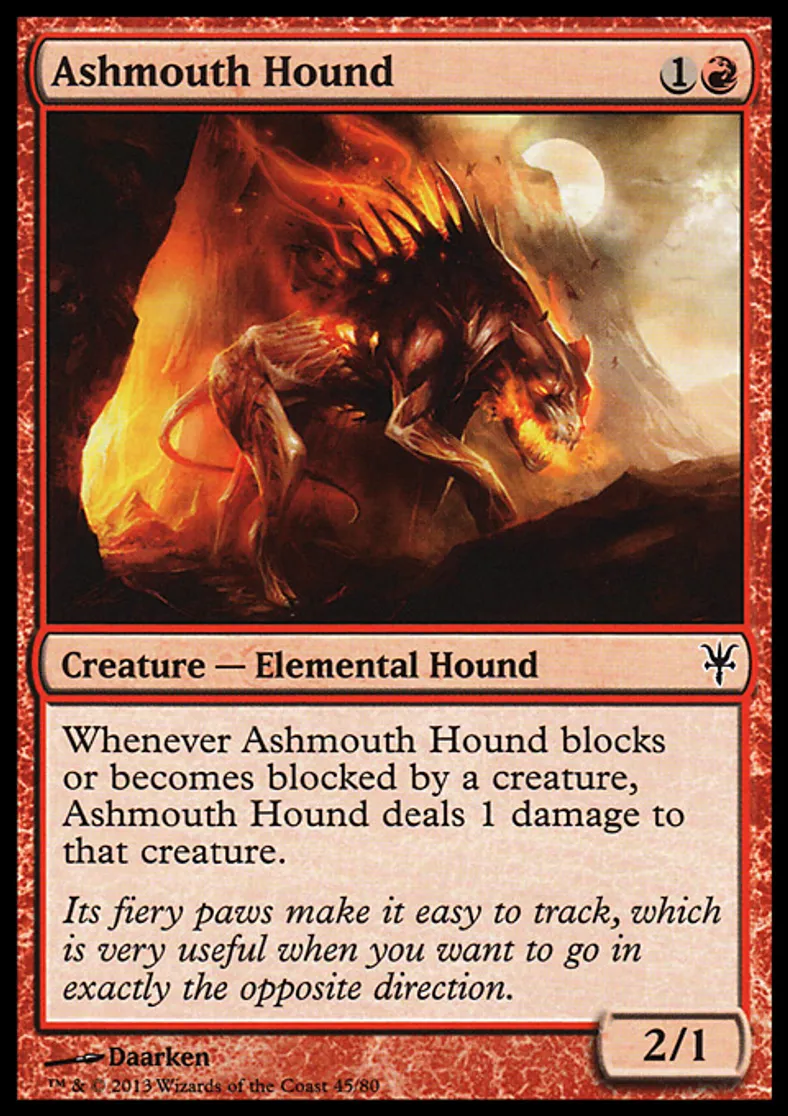 | Oracle Text | Whenever Ashmouth Hound blocks or becomes blocked by a creature, Ashmouth Hound deals 1 damage to that creature. | ||