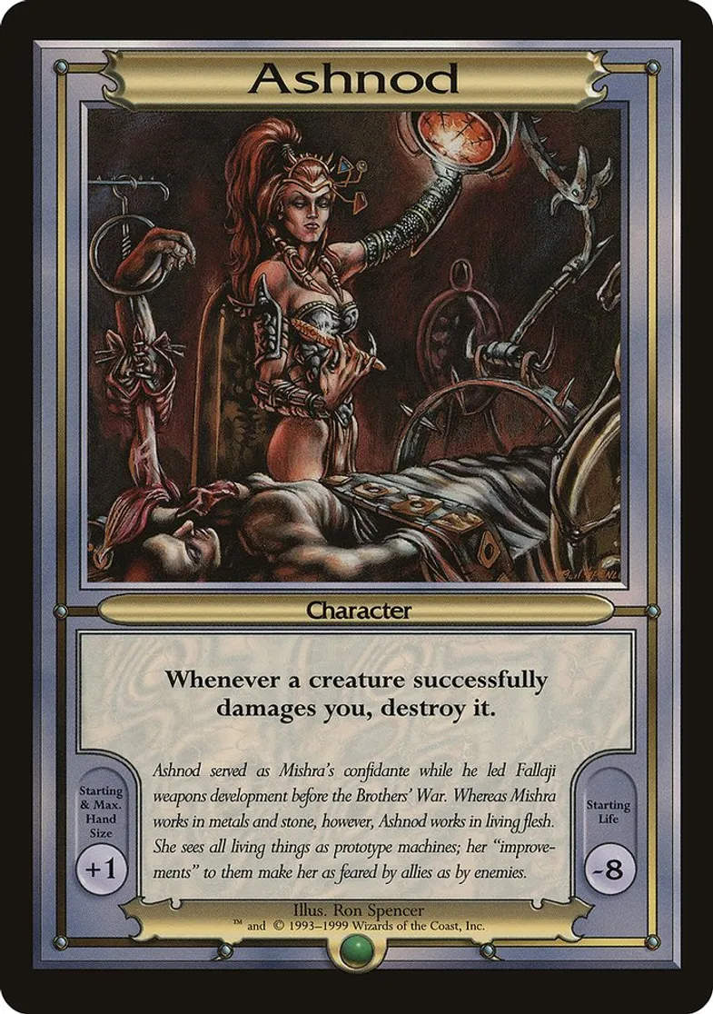 | Flavor Text | Ashnod served as Mishra’s confidante while he led Fallaji weapons development before the Brothers’ War. Whereas Mishra works in metals and stone, however, Ashnod works in living flesh. She sees all living things as prototype machines; her “improvements” to them make her as feared by allies as by enemies. | ||