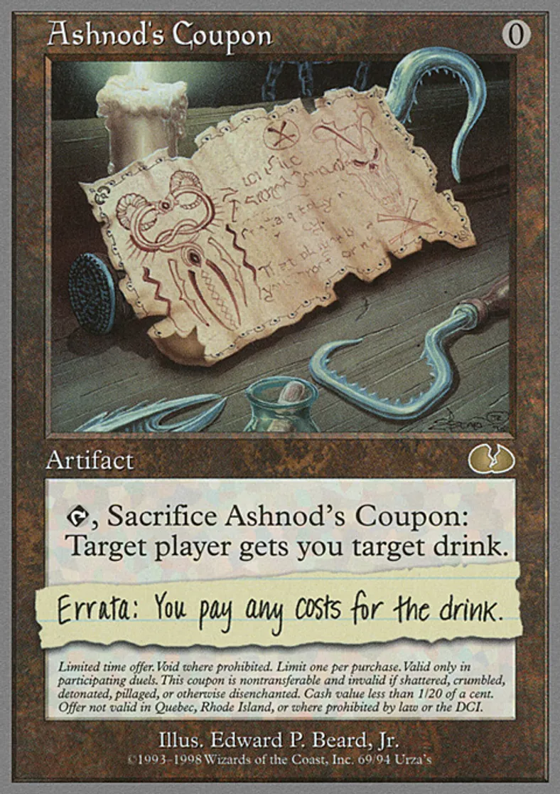 | Oracle Text | ocT, Sacrifice Ashnod's Coupon: Target player gets you target drink. Errata: You pay any costs for the drink. | ||