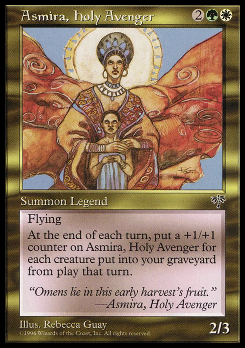 | Oracle Text | Flying At the beginning of each end step, put a +1/+1 counter on Asmira, Holy Avenger for each creature put into your graveyard from the battlefield this turn. | ||