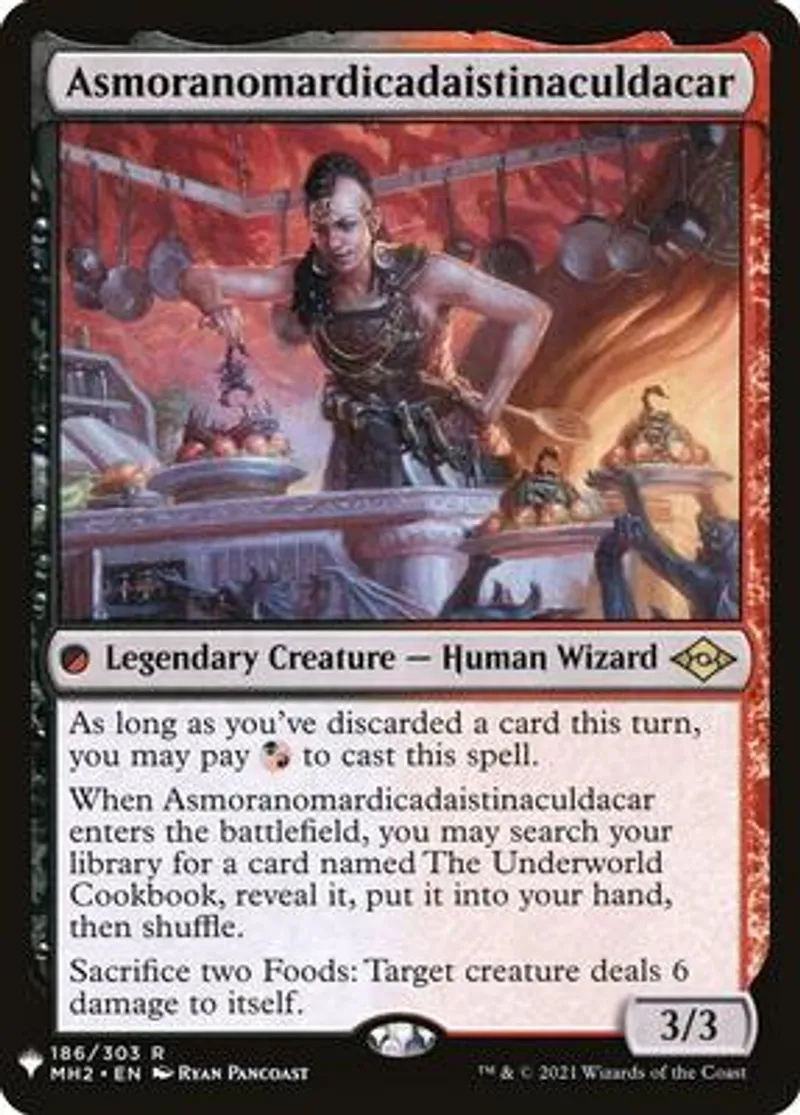 When Asmoranomardicadaistinaculdacar enters the battlefield, you may search your library for a card named The Underworld Cookbook, reveal it, put it into your hand, then shuffle.