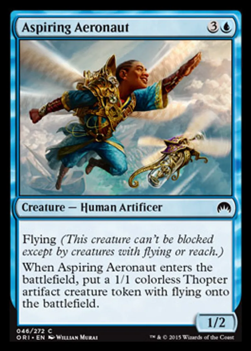 | Oracle Text | Flying (This creature can't be blocked except by creatures with flying or reach.) When Aspiring Aeronaut enters the battlefield, put a 1/1 colorless Thopter artifact creature token with flying onto the battlefield. | ||
