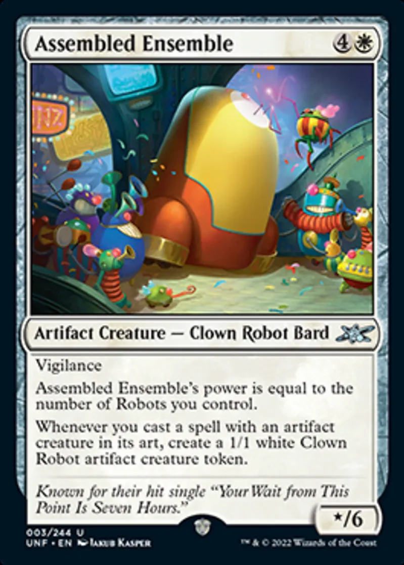 Magic: the Gathering (mtg) Uncommon Artifact Creature — Clown Robot Bard Assembled Ensemble from Unfinity (UNF) last updated 2026-02-21 16:13:01