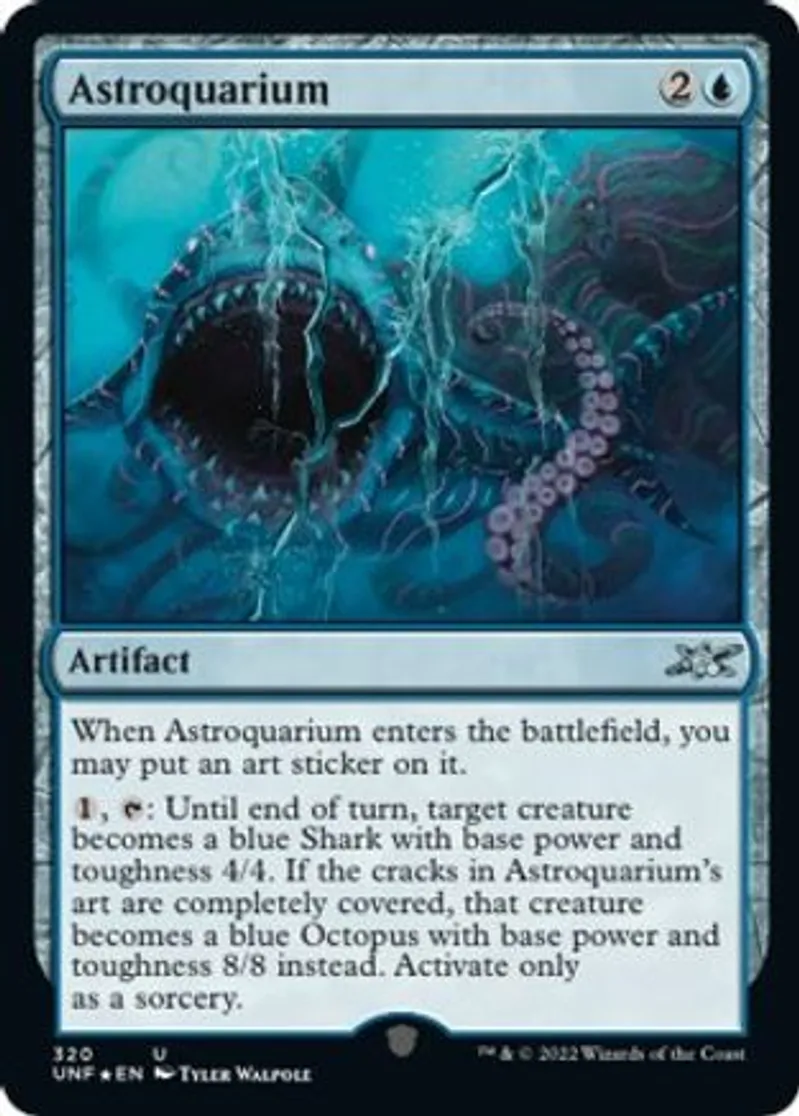 {{1}}, {{t}}: Until end of turn, target creature becomes a blue Shark with base power and toughness 4/4. If the cracks in Astroquarium’s art are completely covered, that creature becomes a blue Octopus with base power and toughness 8/8 instead. Activate only as a sorcery. | ||