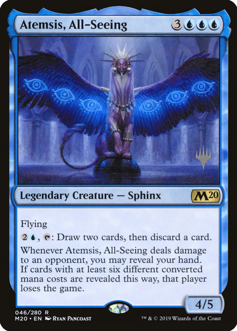 | Oracle Text | Flying\r\n{{2}}{{u}}, {{t}}: Draw two cards, then discard a card.\r\nWhenever Atemsis, All-Seeing deals damage to an opponent, you may reveal your hand. If cards with at least six different converted mana costs are revealed this way, that player loses the game. | ||
