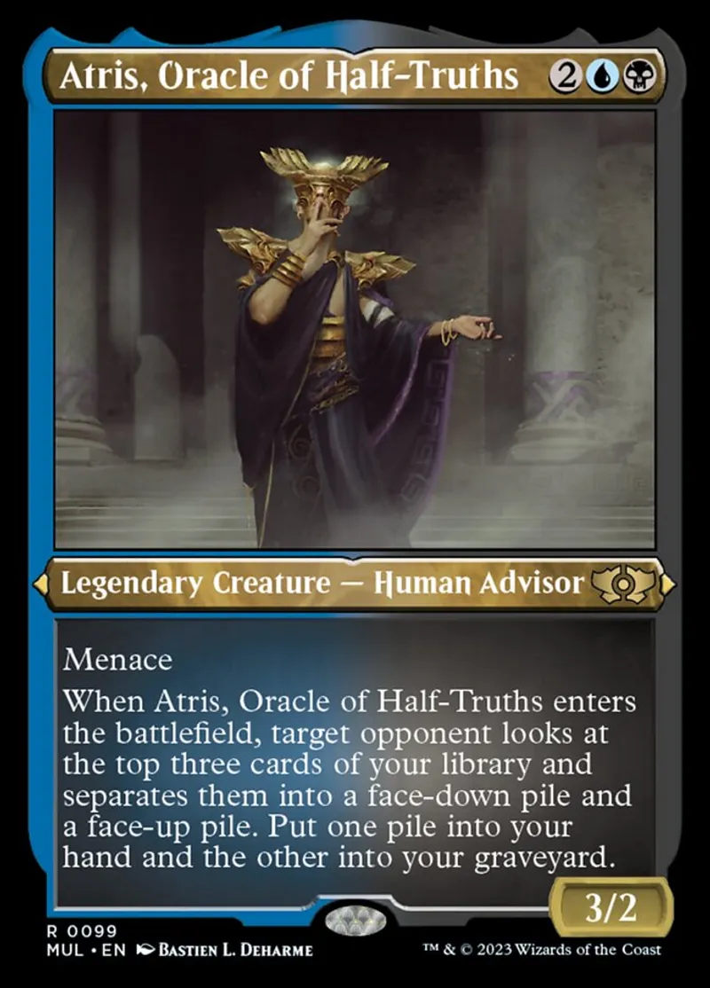 When Atris, Oracle of Half-Truths enters the battlefield, target opponent looks at the top three cards of your library and separates them into a face-down pile and a face-up pile. Put one pile into your hand and the other into your graveyard. | ||