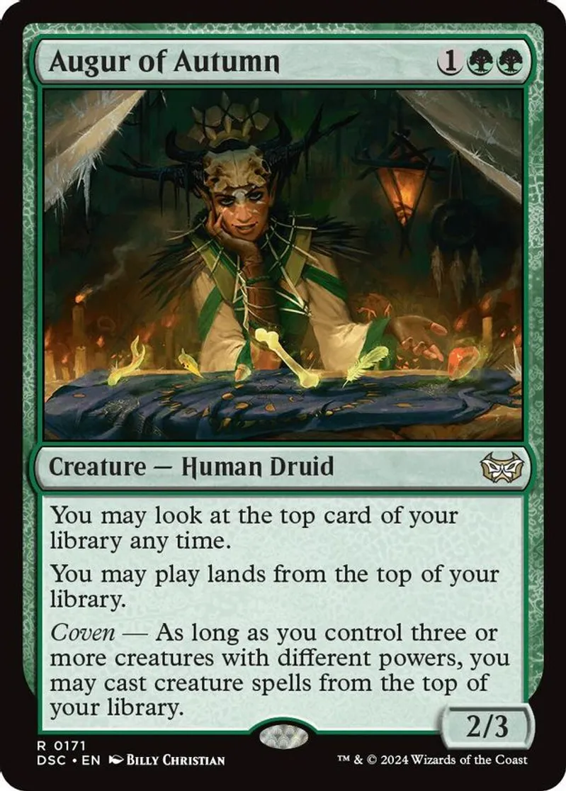 Magic: the Gathering (mtg) Rare creature — human druid Augur of Autumn from Commander: Duskmourn: House of Horror (DSC) last updated 2026-02-21 15:27:06