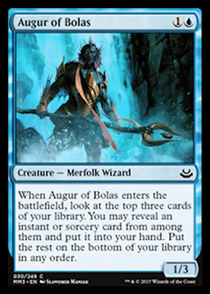 | Oracle Text | When Augur of Bolas enters the battlefield, look at the top three cards of your library. You may reveal an instant or sorcery card from among them and put it into your hand. Put the rest on the bottom of your library in any order. | ||