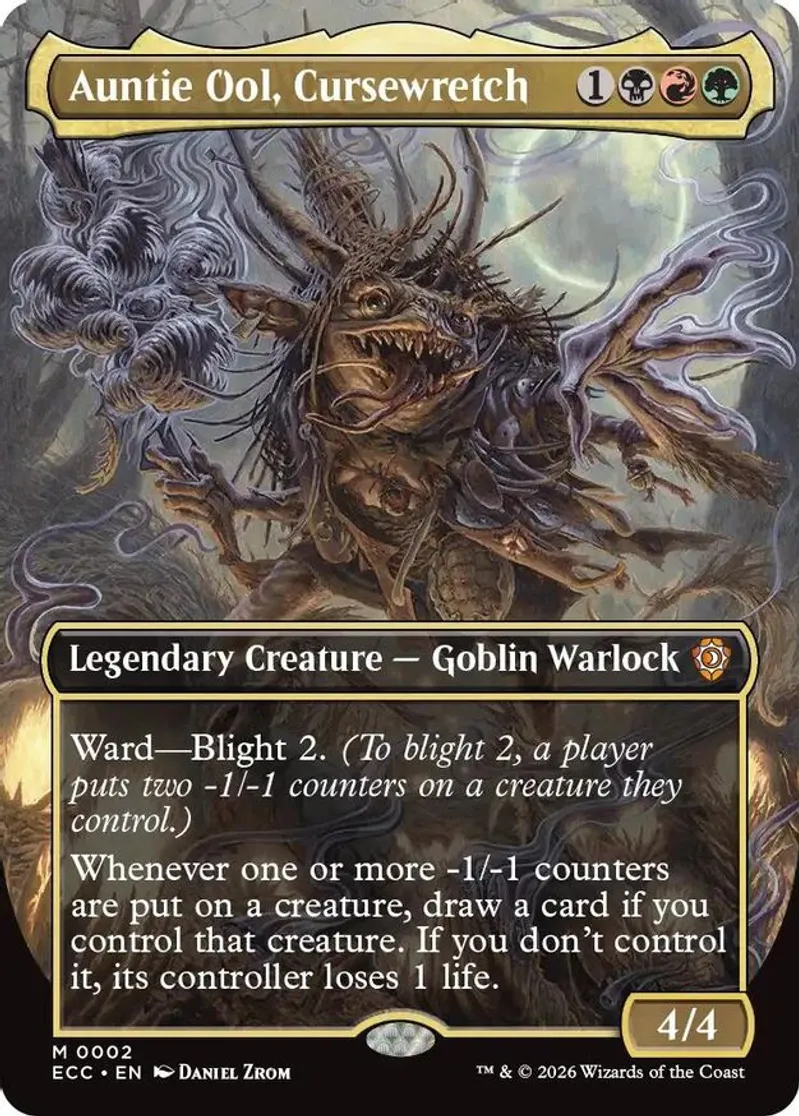 Auntie Ool, Cursewretch (Borderless) is a Mythic Rare in the set Commander: Lorwyn Eclipsed.